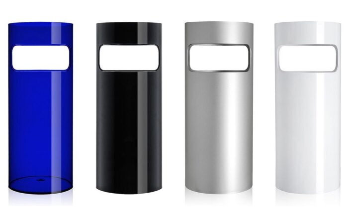 Gino Colombini Design umbrella stand cylindrical container injection molded. Shiny, colorful, easy to clean and indestructible. The umbrella stand with a circular base is characterized by two side openings that enable you to use the bottom as a waste paper basket. The umbrella stand can be supplied with stainless steel top Pan can be used as an ashtray. Composition: ABS dimensions: width: 25.0 Cm length: 60.0 Cm colours: blue, smoke grey, red, white, black, silver. Steel ashtray.
